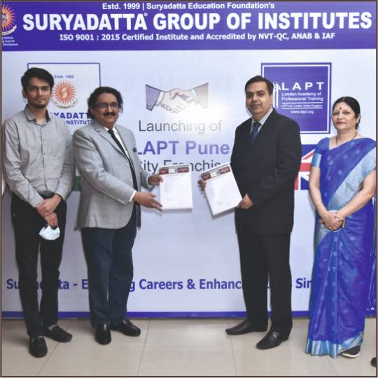 Suryadatta Group of Institutes (SGI) has signed an agreement with London Academy of Professional Training (LAPT), a British company providing certification for the last 15 years & listed with UKRLP (UK Register of Learning Providers).