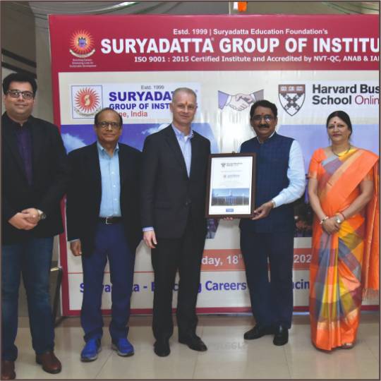 Director of Harvard Business School (Online) Mr. Ross Pearo handed over certificate of MOU to Professor Dr. Sanjay Chordiya, Founder President and Chairman of Suryadatta Education Foundation. Mrs Sushama S Chordiya, Vice President & Secretary, Suryadatta Education Foundation, Shri Sachin Itkar, Strategic Advisor & Mr Akshit Kushal, Executive Director, Suryadatta Group of Institutes were present on the occasion.