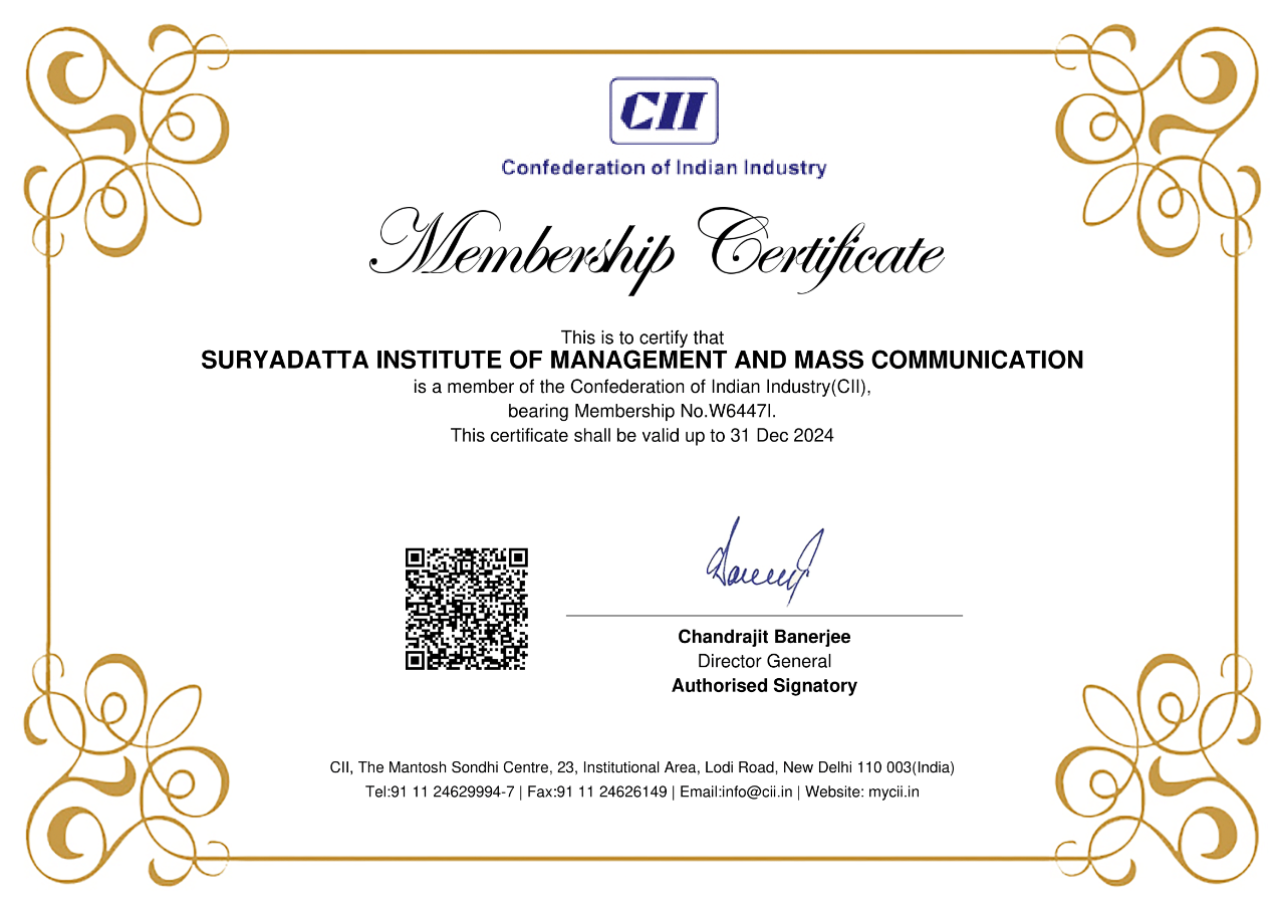 Suryadatta Institute of Management and Mass Communication (SIMMC) is proud to announce its membership with the Confederation of Indian Industry (CII), a prestigious association promoting industry growth and excellence. This esteemed recognition underscores SIMMC’s commitment to fostering industry-academia collaboration, innovative learning, and entrepreneurial spirit.