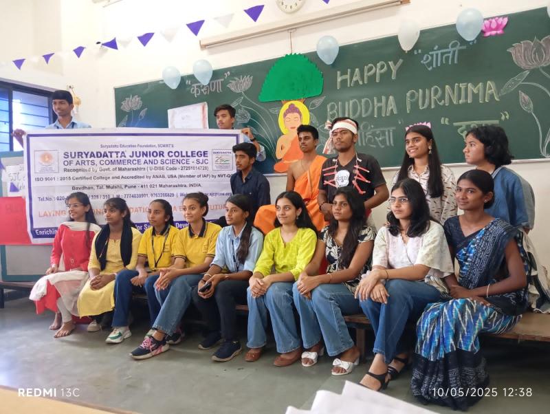 On the auspicious occasion of Buddha Purnima, celebrated on 10th May 2025, the students of Suryadatta Junior College enthusiastically organized a meaningful program at the college premises, spreading the timeless message of peace, love, non-violence, patience, and kindness inspired by Lord Buddha’s teachings.